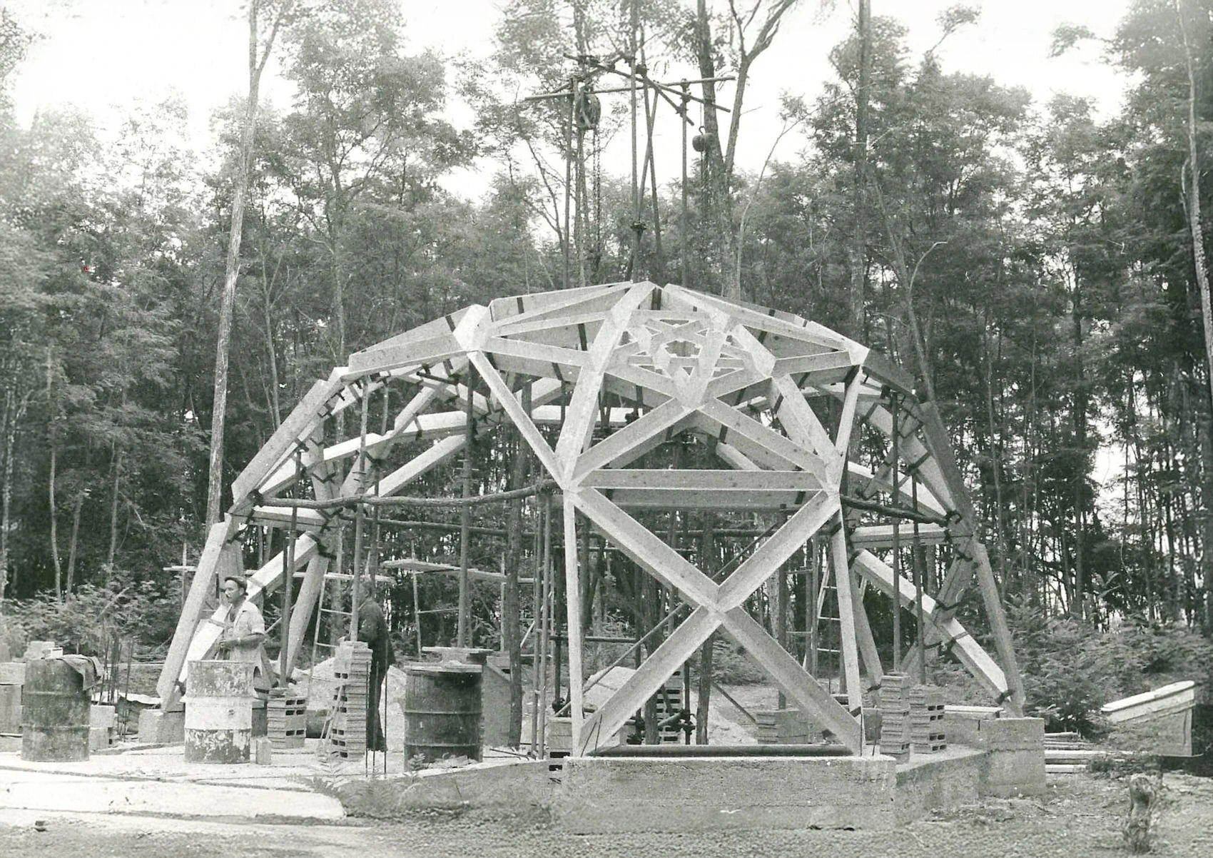 Si les structures géodésiques de Buckminster Fuller trouvaient principalement application pour des bâtiments utilitaires et temporaires, par les moyens d’un treillis de métal ou de bois et d’une couverture de plastique, ici la structure proposée par Delekta est en béton armé, et les panneaux de remplissage en bois aggloméré recouverts d’une toile d’hypalon (⁴).
