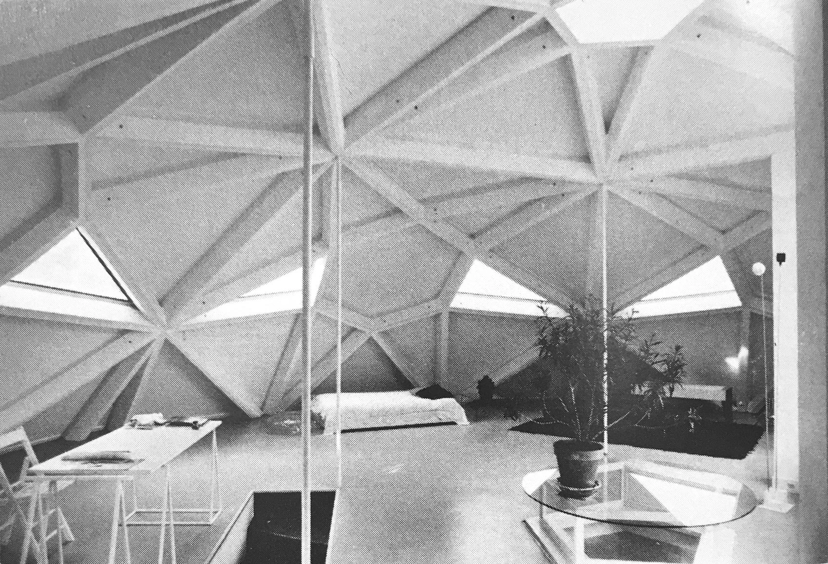 Dans la foulée, Daladier et son équipe construisent un autre prototype : Contrepoint, dont le nom est pensé en rapport au caractère expérimental des Trois Coupoles et qui, bien que présentant quelques originalités, répond à une conception plus traditionnelle de l’habitat (¹¹). Cet interlude ne fait que précéder le retour d’une proposition à nouveau très originale avec la conception d’un troisième prototype, la Géode (1972), qui apparait de l’extérieur sous la forme d’une résille de béton armé, à la manière d’« un vaste filet jeté sur l’espace (¹²) ».