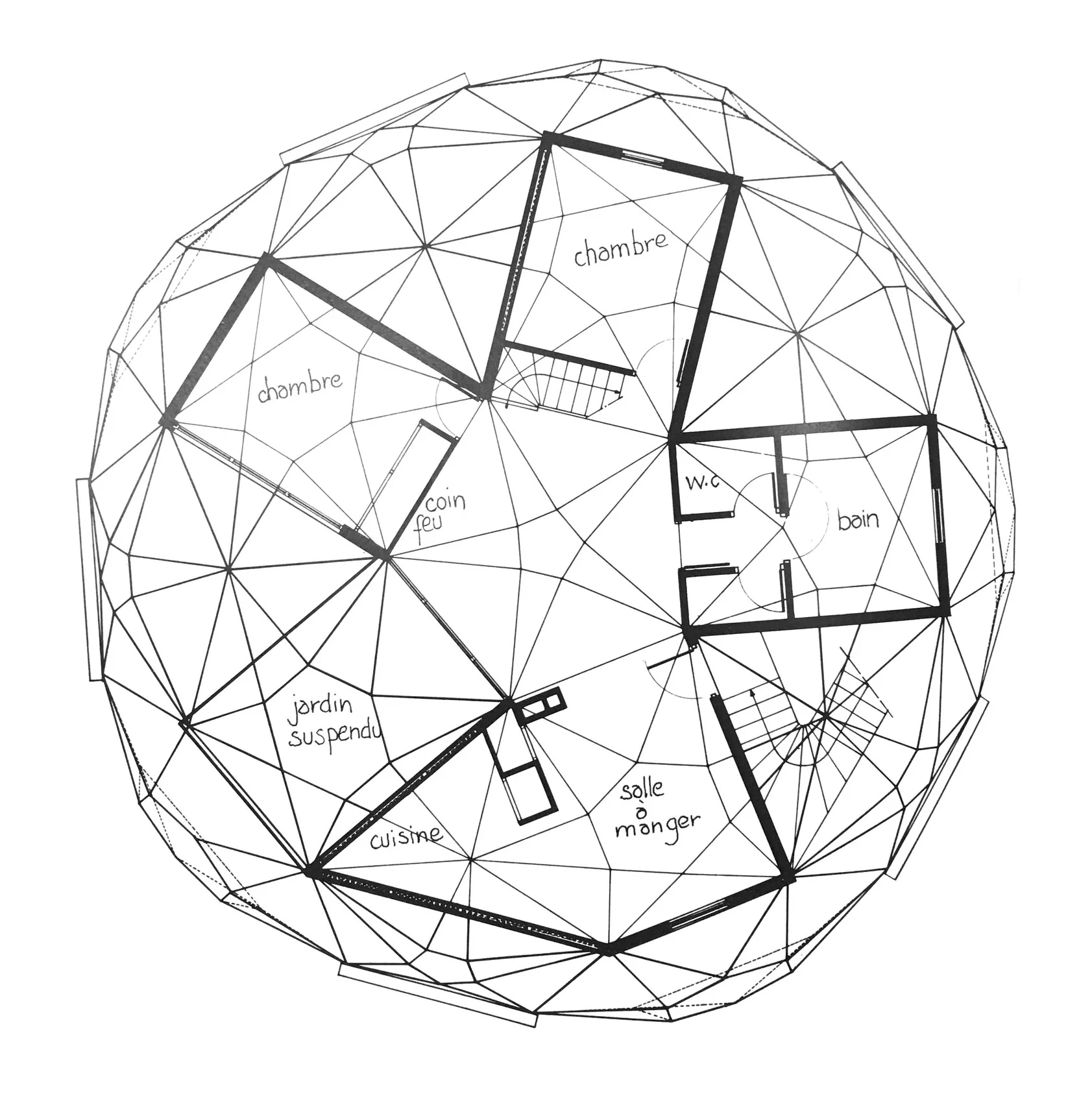 Si ce prototype est sensiblement plus grand que le premier, il répond en théorie aux mêmes principes de modulation que les Trois Coupoles : la maison, dont les volumes habitables sont inscrits sous la résille, parfois en retrait, pourrait être agrandie (jusqu’à l’immeuble collectif) ou rétrécie en fonction des variations des besoins de ses habitantes et habitants (¹³). Une organisation des espaces sur trois niveaux, ainsi que la présence de multiples cloisons les délimitant, rompent cette fois l’aspect de continuité recherché dans les Trois Coupoles. La déambulation ménage néanmoins des surprises et des éléments de liaison : des terrasses suspendues invitent à une connexion, par le regard, des pièces à vivre et de l’espace extérieur, tout comme le percement pentagonal entre le premier étage et le volume sommital, lui-même prolongé par une trouée vers le ciel.
